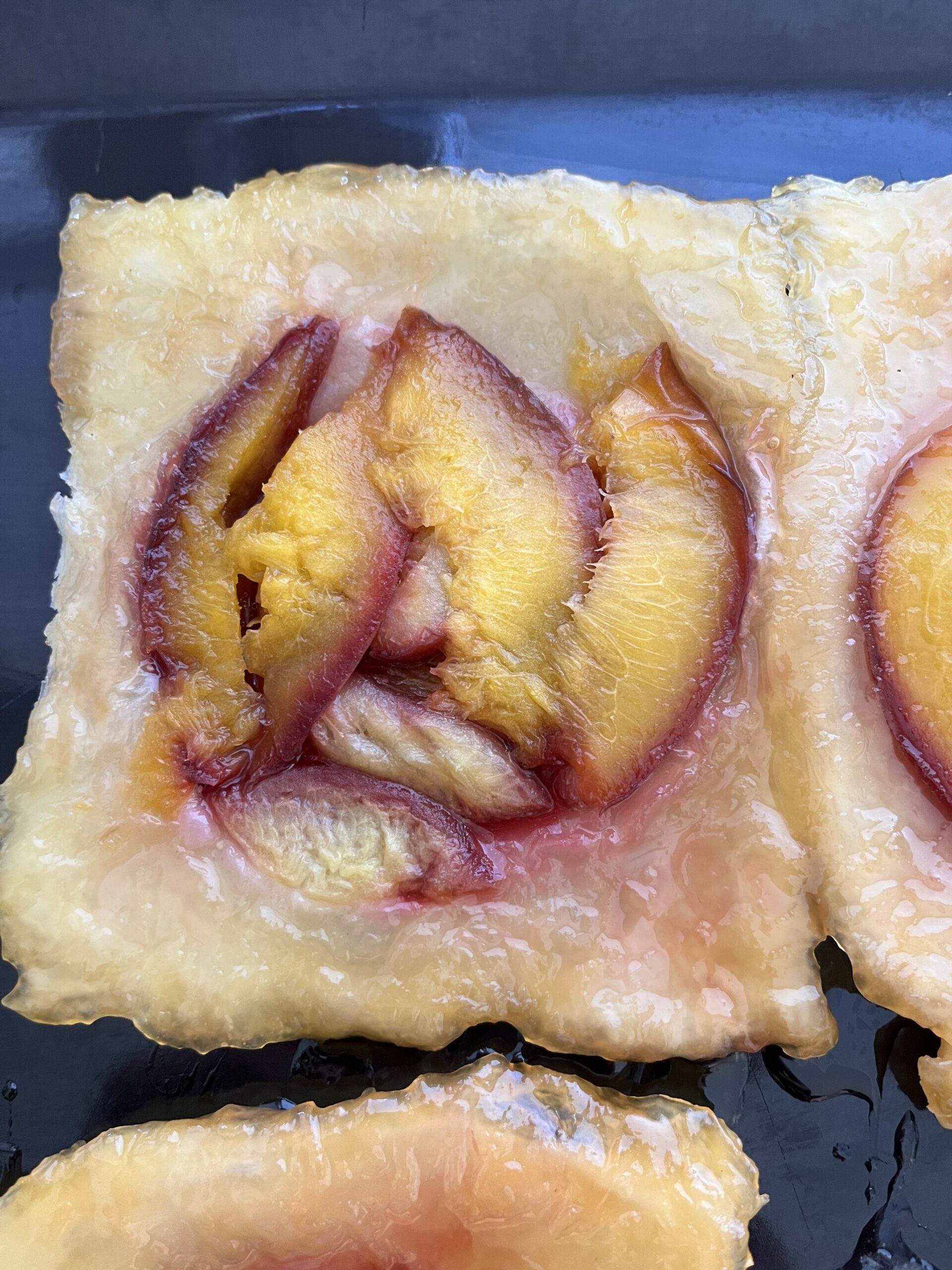 Výsledok je šťavnatý koláčik, plný ovocia a jeho povrch je skaramelizovaný med. My sme použili broskyne a slivky, med som dala iba zo spodnej strany, ale asi odporúčam na slivky dať aj zvrchu, ak nie sú prezreté, počas pečenia sa stane ich šupka kyselkavá. Koláču to dodá sviežosť.